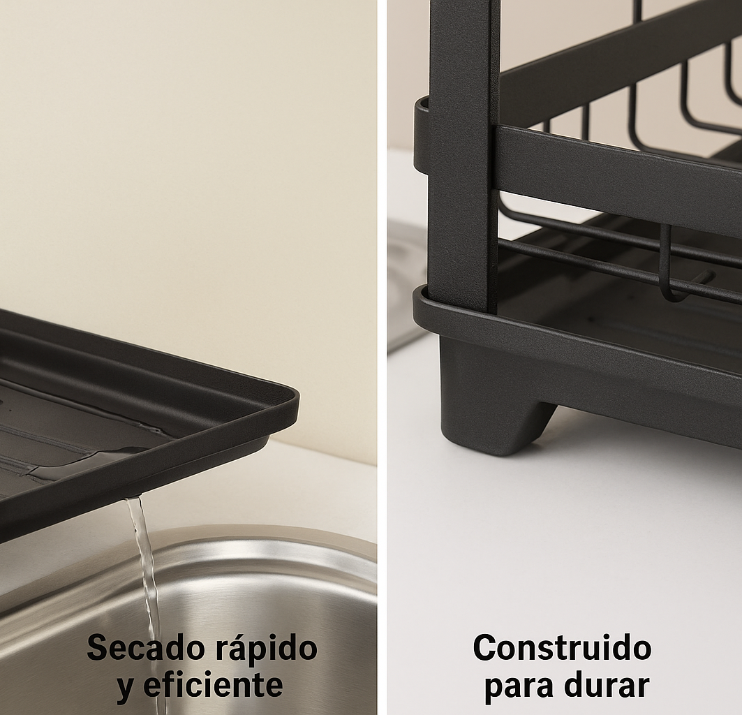 El escurridor combina secado rápido y eficiente gracias a su sistema de drenaje que dirige el agua directamente al fregadero, evitando charcos y humedad, con una estructura construida para durar, fabricada en acero al carbono resistente al óxido y diseñada para soportar el uso diario en tu cocina.